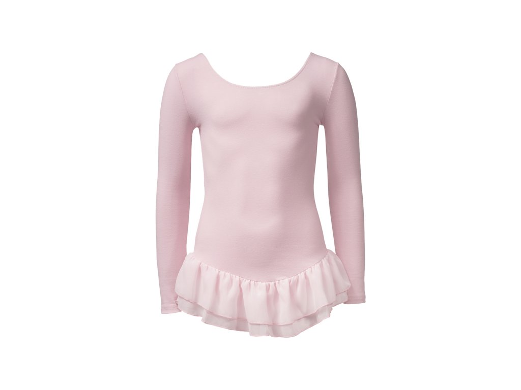 Dětský baletní trikot je doplněn dvojitou krátkou sukýnkou. Je vyroben z bavlny takže je příjemný na nošení. Tento krásný oblek s dlouhými rukávy udržuje malou baletku v teple během výuky.