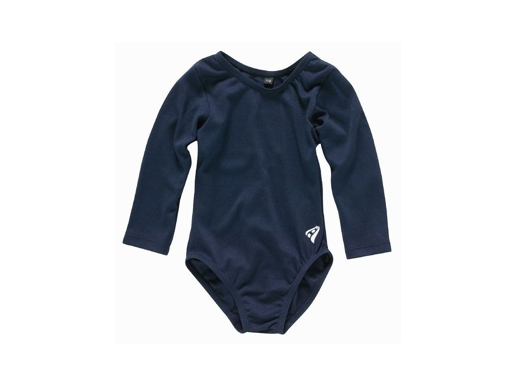 Gymnastický / taneční dres. Gymnastický dres má kulatý výstřih a tříčtvrteční rukáv.