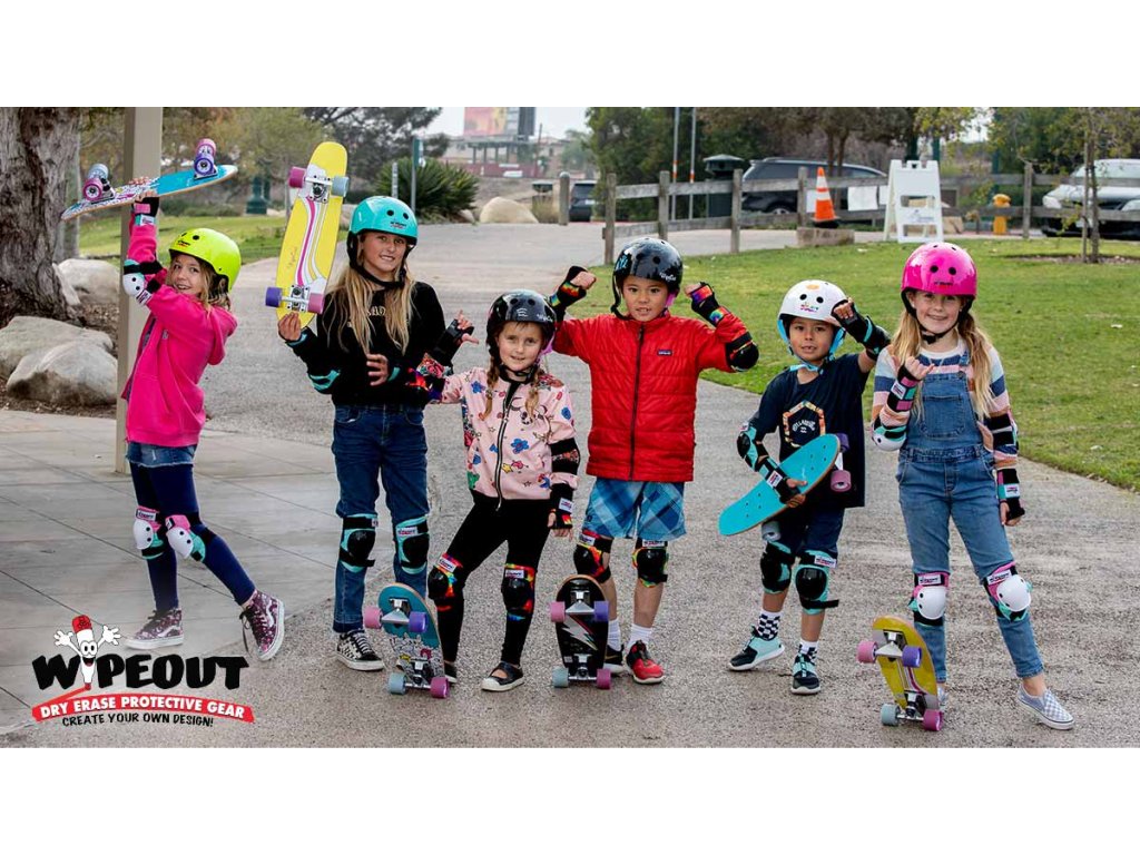 Dětské přilby Wipeout pro kolo, brusle a koloběžku. Pomocí fluorescenčních fixů si můžete vytvořit vlastní vzory. Robustní a stylové helmy jsou k dispozici v různých barvách. Každá helma se dodává s 5 suchými stíratelnými netoxickými fixy v různých neonových barvách a sadou šablon s 8 úžasnými tvary.