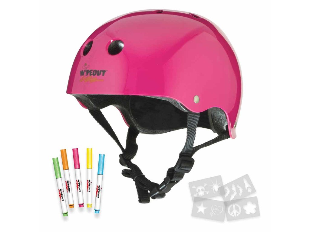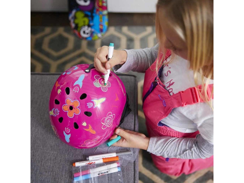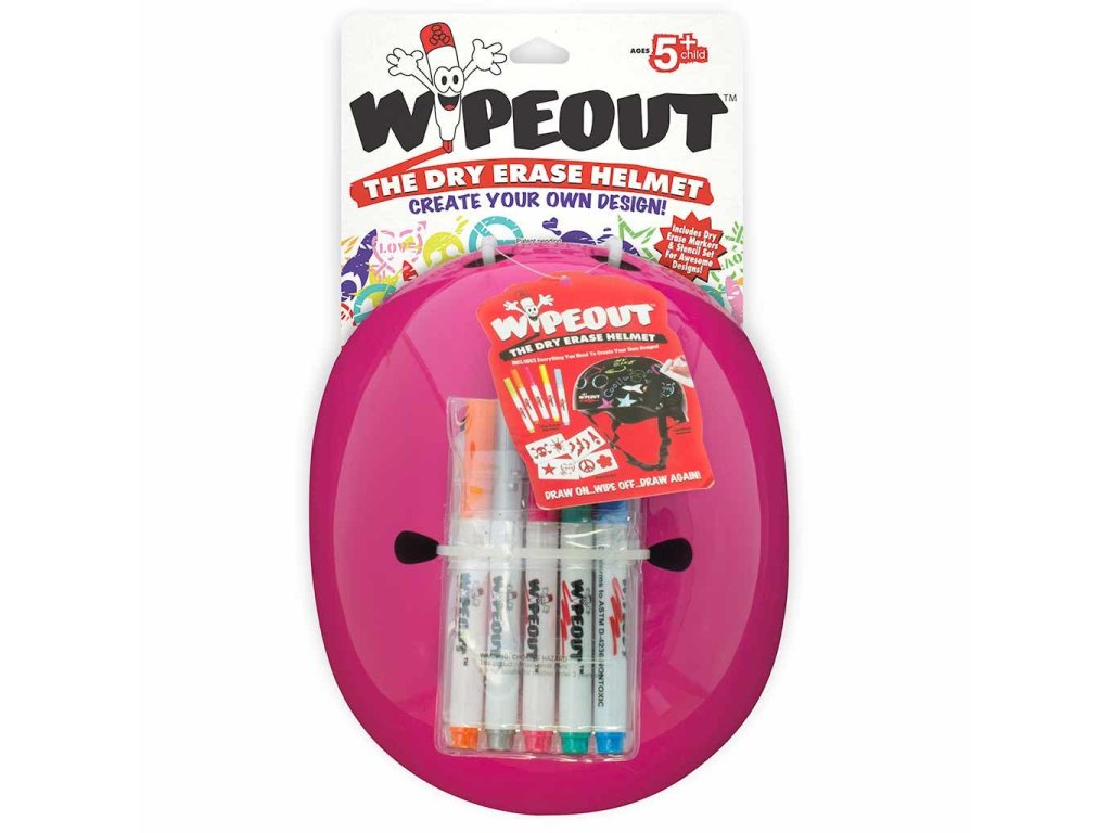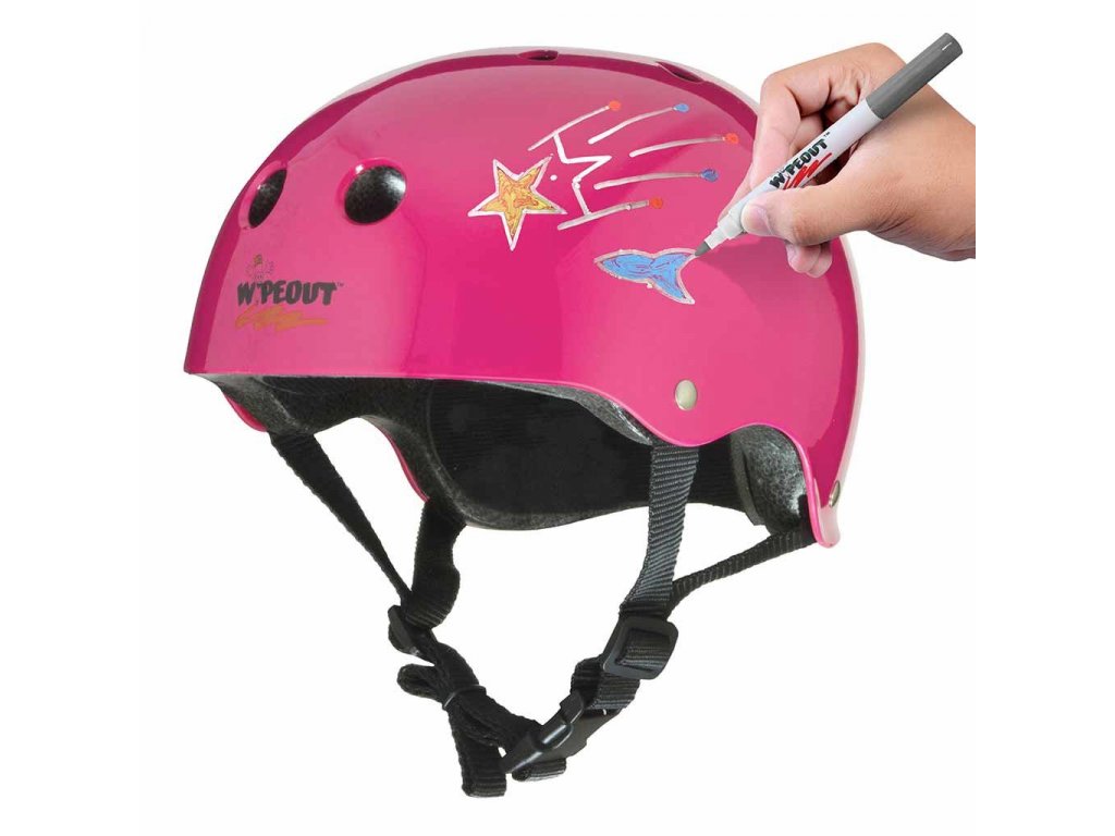 Dětské přilby Wipeout Dry Erase pro kolo, brusle a koloběžku. Pomocí fluorescenčních fixů si můžete vytvořit vlastní vzory. Robustní a stylové helmy jsou k dispozici v různých barvách. Každá helma se dodává s 5 suchými stíratelnými netoxickými fixy v různých neonových barvách a sadou šablon s 8 úžasnými tvary.